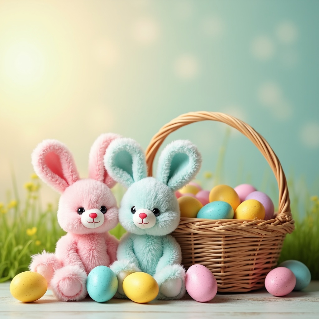Two cute plush toy bunnies, one pink and one blue, sit together next to a woven Easter basket overflowing with colorful eggs. The bunnies have floppy ears, smiling faces, and are positioned on a wooden surface with green grass and yellow flowers in the background. A soft pastel gradient sky with glowing bokeh lights adds an Easter theme.