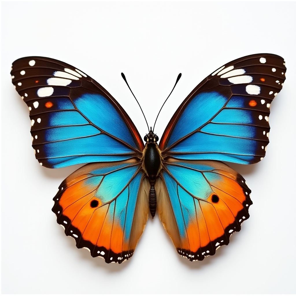 black edges, blue morpho, blue wings, insect, isolated background, morpho butterfly, nature, orange wings, vibrant colors, white spots, wildlife, wings spread, butterfly