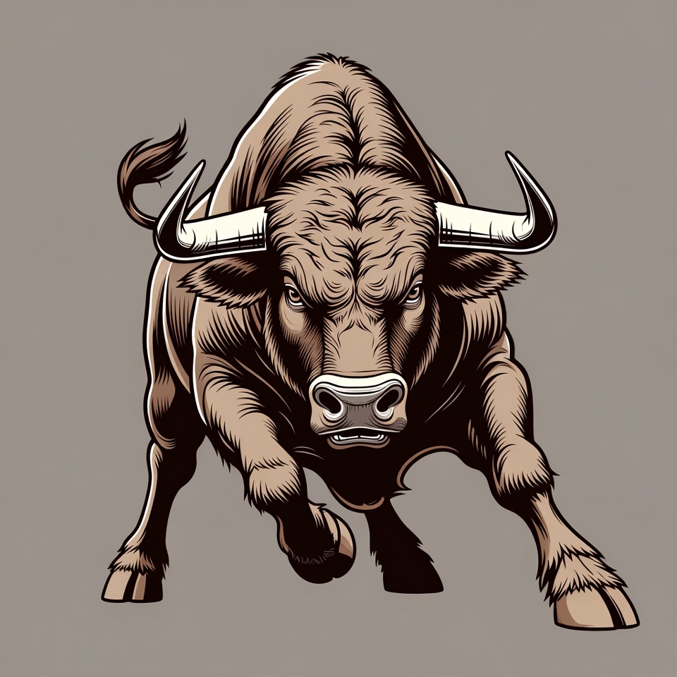 A detailed vector illustration of a powerful brown bull charging forward on a gray background. The bull has large curved horns, muscular body, and aggressive posture with front hooves raised. Its fur is textured with dynamic shading in a hand-drawn style.