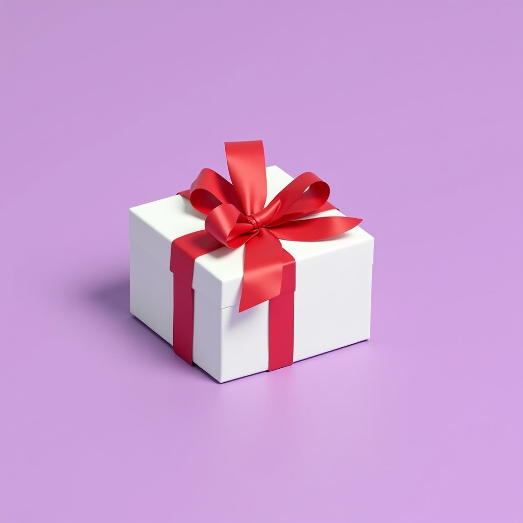 Christmas present, birthday gift, box, celebration, festive, holiday gift, isolated, present, purple background, red bow, red ribbon, satin ribbon, white box, wrapped gift, gift box