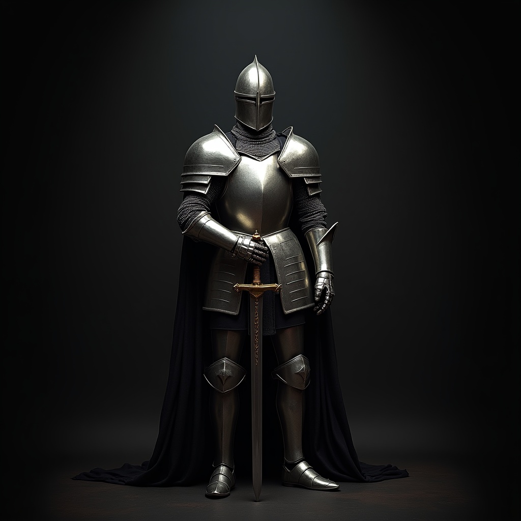 3D render, armor, cape, chivalric, dark background, full body, gauntlets, helmet, isolated background, male, medieval knight, plate armor, shining armor, standing, steel armor, sword, warrior, knight