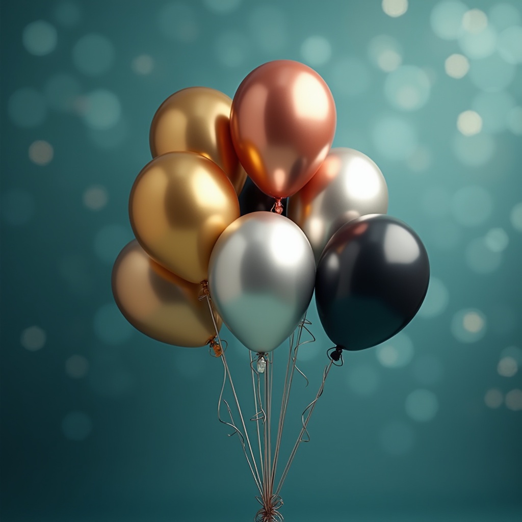 3D balloons, balloon bouquet, balloon strings, balloons cluster, black balloons, bokeh background, celebration balloons, decoration balloons, event balloons, festive balloons, floating balloons, gold balloons, holiday balloons, isolated background, luxury balloons, metallic balloons, multicolored balloons, party balloons, rendered balloons, rose gold balloons, shiny balloons, silver balloons, teal background, balloons