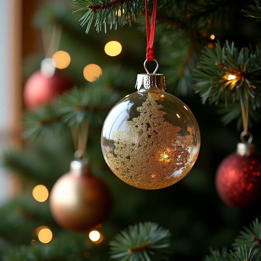 A clear glass Christmas ornament filled with gold snowflake design hangs from a green pine tree branch. Surrounding ornaments include red, gold, and metallic balls, with warm bokeh lights in the background. The tree features fresh green needles and red ribbons.