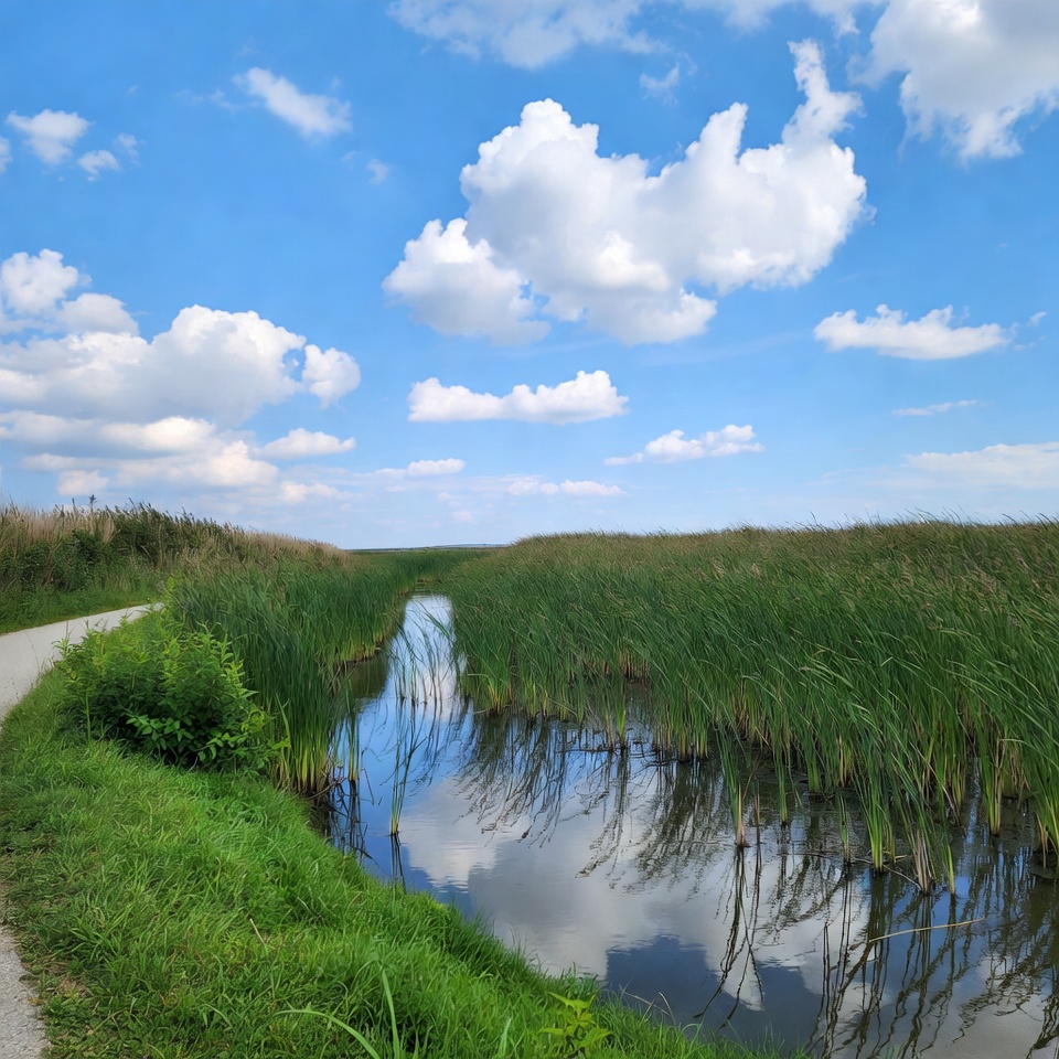 blue sky, cattails, clouds, environment, grass, gravel path, green grass, landscape, lush vegetation, narrow trail, nature, outdoor, path, reeds, reflection, riverbank, scenery, sky, trail, water, waterway, wetland, white clouds, marsh