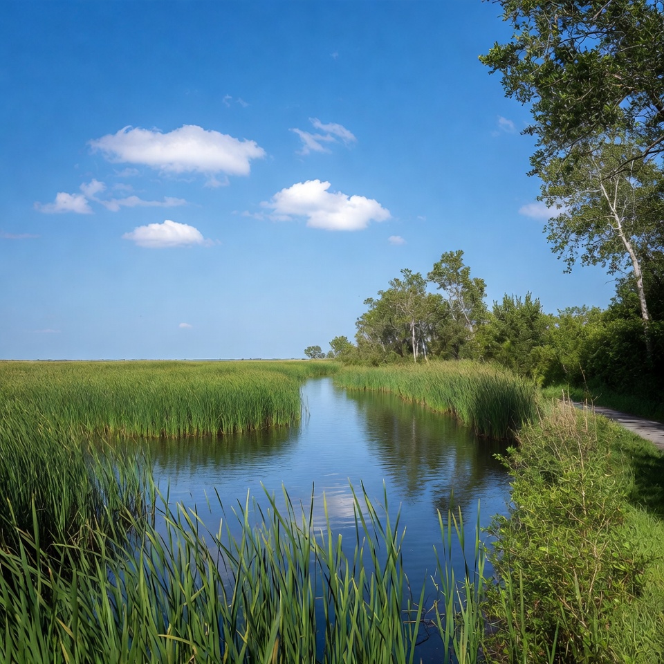 A narrow waterway winds through tall green reeds and cattails in a marshy landscape. A gravel path runs alongside the creek, bordered by lush green bushes and trees. Fluffy white clouds dot the clear blue sky above the serene natural scene.