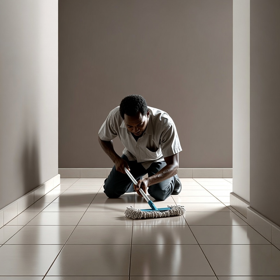 African-American, beige walls, blue mop, cleaning, corridor, dark pants, dress shoes, floor cleaning, gray shirt, hallway, indoor, janitor, kneeling, mop, mopping, shiny tiles, short sleeve shirt, tiled floor, worker, man