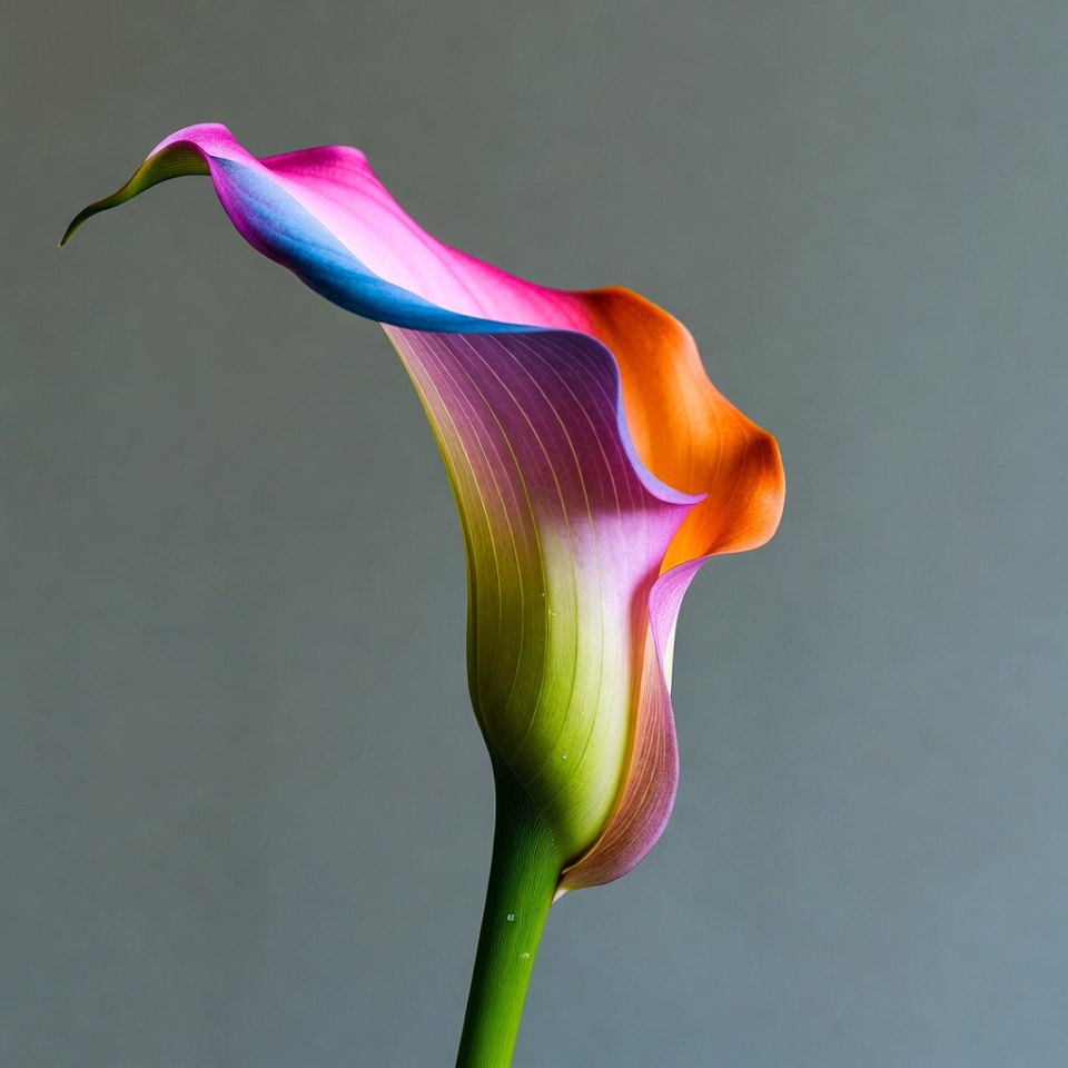 A vibrant calla lily flower features a curved spathe in shades of pink, blue, purple, orange, and green. The flower stands tall on a slender green stem against a plain gray background. Fine veins are visible along the spathe's surface.