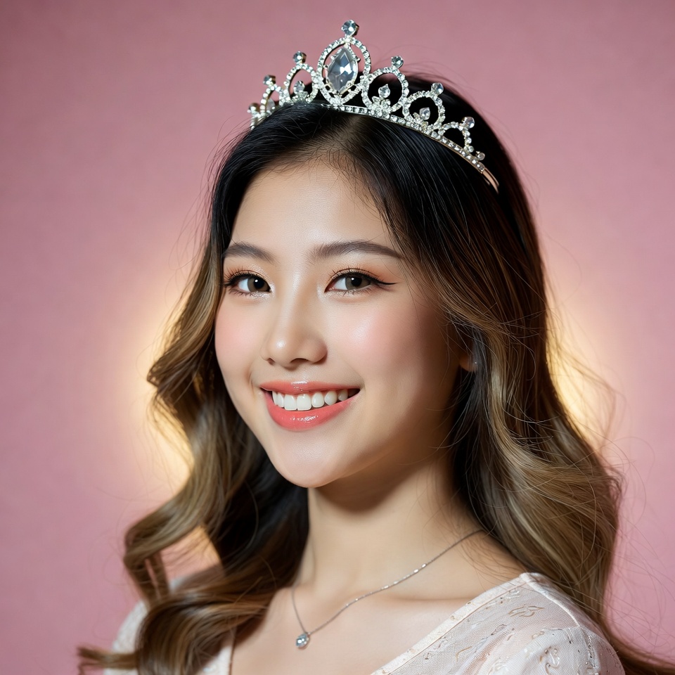 A young Asian woman with long wavy dark hair smiles at the camera while wearing a sparkling rhinestone tiara. She has a silver necklace and wears a white lace top. The image features a pink background with soft lighting.