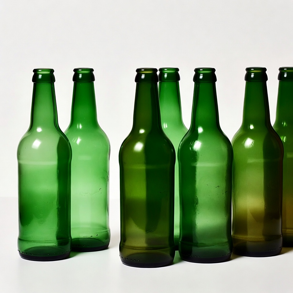 beer bottles, beverage containers, bottle necks, bottles group, clear glass, empty bottles, glass bottles, green glass, isolated, product photography, still life, transparent bottles, upright bottles, white background, green bottles