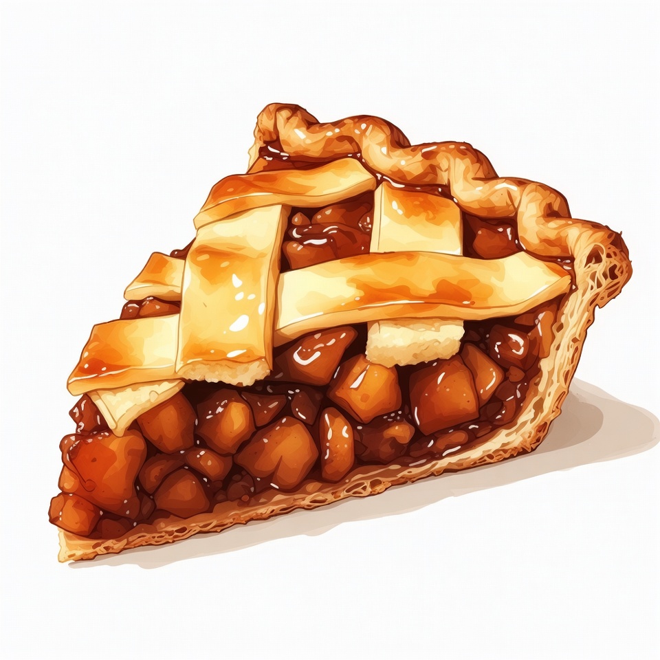 A detailed illustration of a slice of apple pie with golden lattice crust on top. Shiny brown apple filling glistens between the crust layers. The slice sits on a white isolated background.