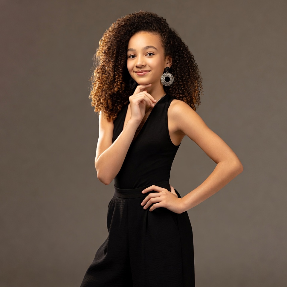 A young Black girl with long curly hair stands against a gray background, wearing a sleeveless black jumpsuit. She poses with one hand on her chin and the other on her hip, smiling slightly. Large silver hoop earrings accent her look.