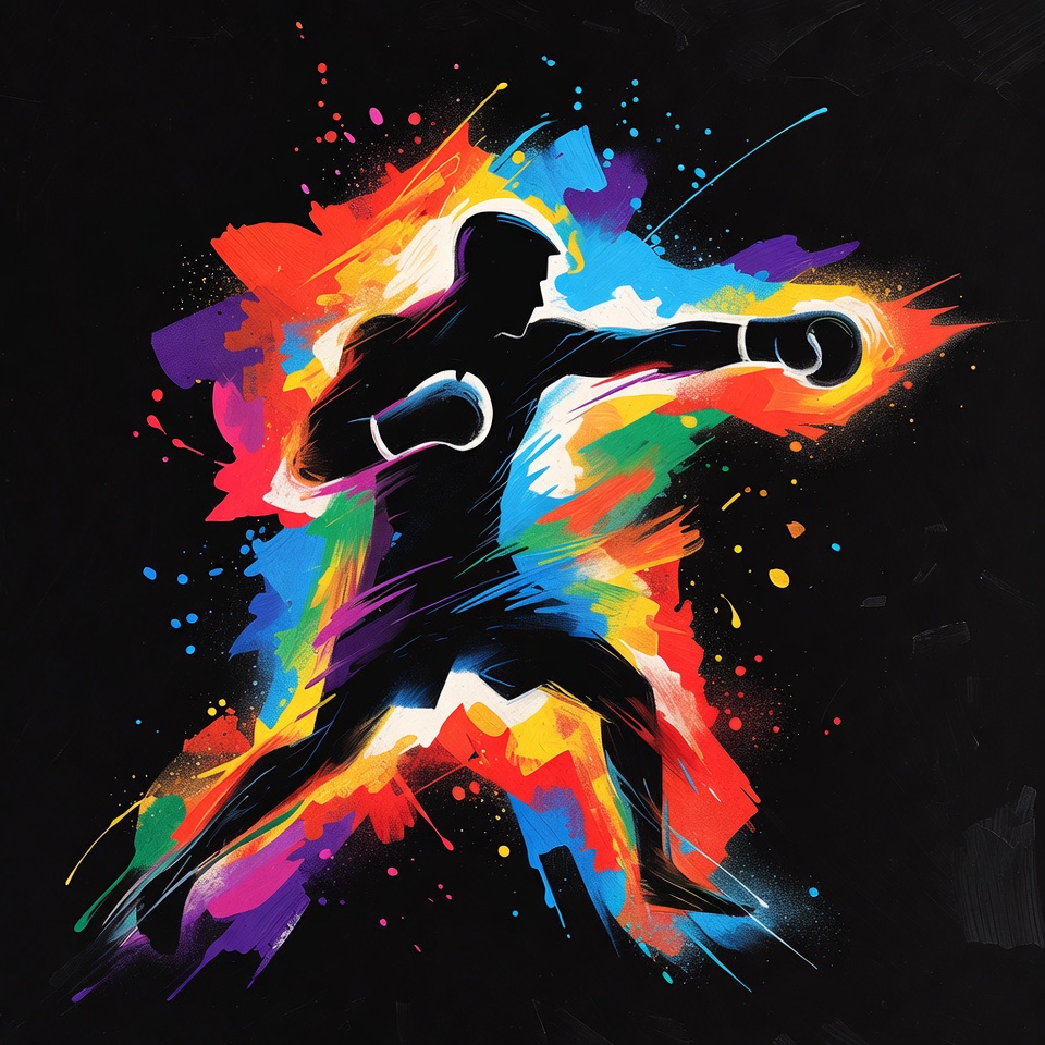 abstract art, action pose, black background, blue splash, boxing gloves, colorful splashes, combat sports, dynamic pose, fighter, illustration, male, man, muscular silhouette, paint splashes, punching, purple splash, red splash, silhouette, sports illustration, vibrant colors, yellow splash, boxer