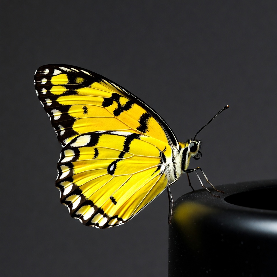 A vibrant yellow butterfly with black and white markings perches on a smooth black cylindrical surface. Its wings are spread open, showcasing intricate patterns and detailed veins. The dark background emphasizes the butterfly's bright colors.