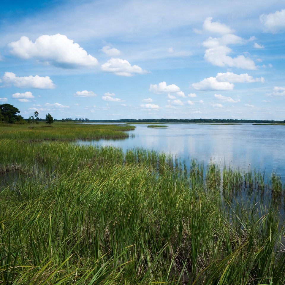 Vibrant green marsh grass lines the edge of a serene lake under a bright blue sky with scattered white clouds. Tall reeds reflect in the calm blue water, with distant trees lining the horizon. The landscape captures a peaceful coastal wetland scene.