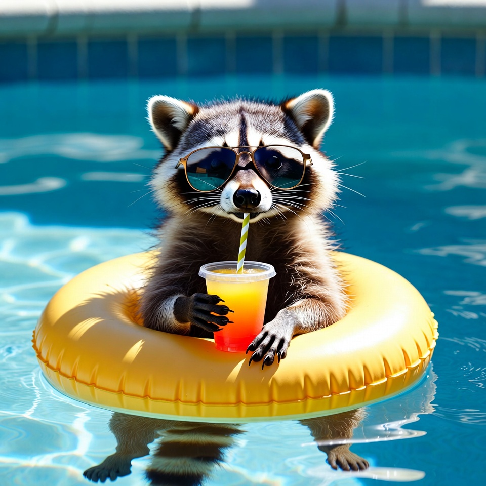 animal, beverages, blue water, cute raccoon, funny animal, gray fur, inflatable ring, masked face, orange drink, paws, pool float, pool party, raccoon sunglasses, straw, summer, sunglasses, swimming pool, vacation, wildlife, yellow floatie, raccoon