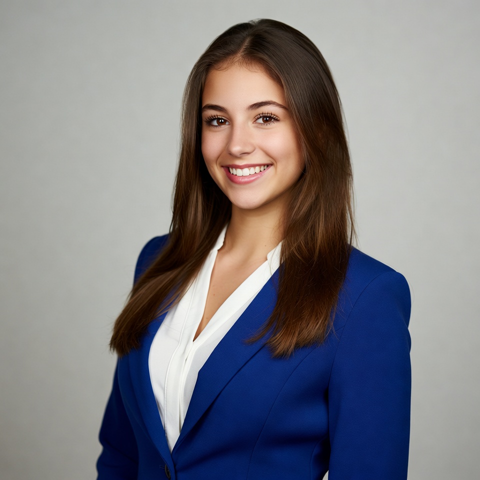 A young woman with long brown hair smiles at the camera against a plain gray background. She wears a blue blazer over a white collared shirt. Her expression is friendly and professional.