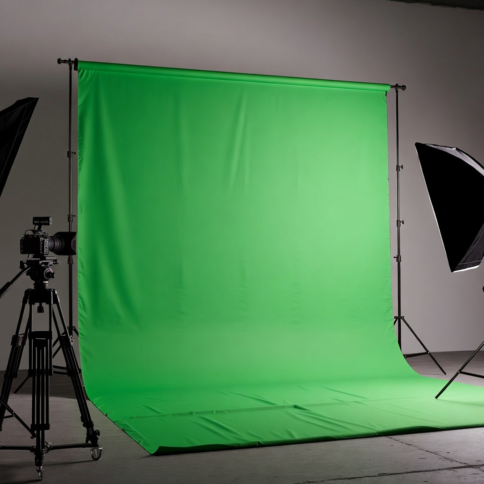 backdrop stand, camera tripod, chroma key, filming equipment, green backdrop, isolated background, lighting equipment, photo studio, photography studio, softbox lights, studio setup, video production, green screen