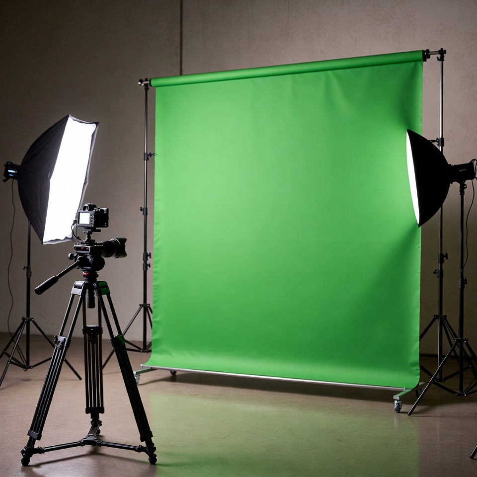 backdrop stand, camera tripod, chroma key, film set, green backdrop, isolated background, lighting equipment, photography studio, production setup, softbox lights, studio lighting, studio setup, video camera, video production, green screen