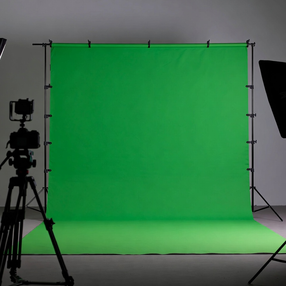backdrop, camera, chroma key, filming equipment, green backdrop, isolated background, light stand, photography studio, professional studio, recording studio, stand, studio setup, tripod, video production, green screen
