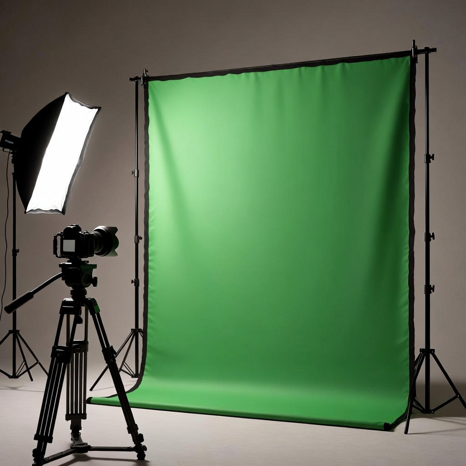 backdrop stand, camera tripod, chroma key, filming setup, green backdrop, isolated background, lighting equipment, photography equipment, professional studio, softbox, studio lights, studio setup, tripod, video camera, green screen