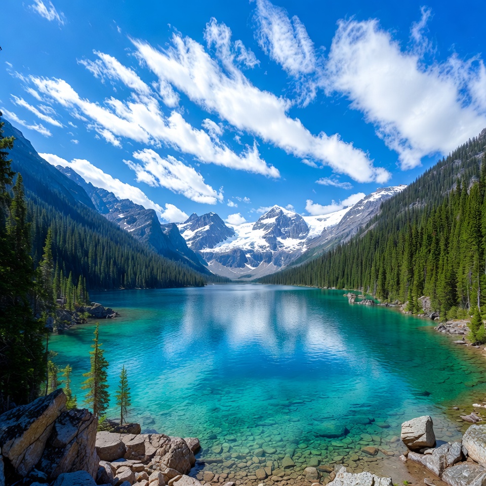 A stunning turquoise lake reflects snow-capped mountains under a bright blue sky with scattered clouds. Dense evergreen forests line the shores, and rocky outcrops frame the foreground. The vibrant colors highlight the pristine Canadian Rockies landscape.