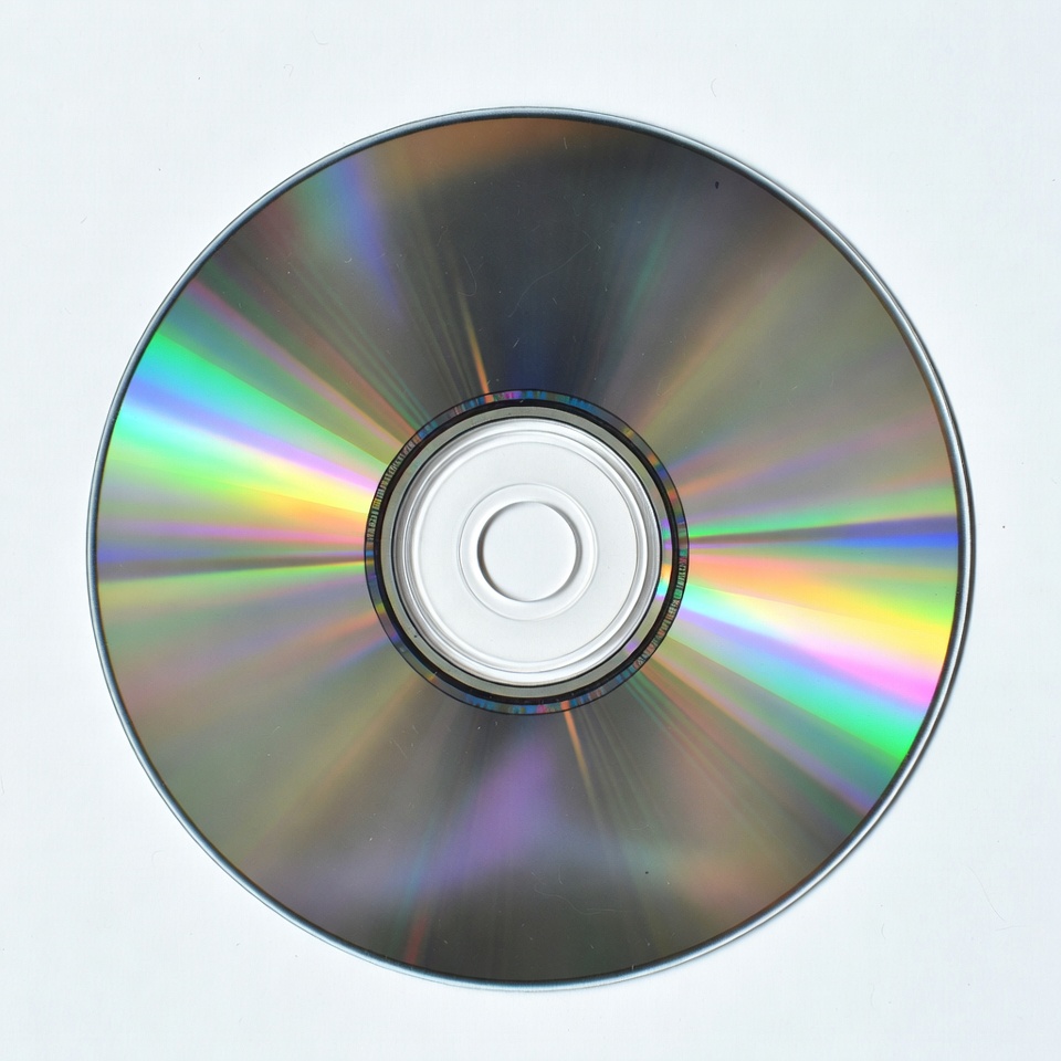DVD, close-up, compact disc, disc, isolated background, media disc, music CD, optical disc, rainbow sheen, reflective surface, shiny disc, silver CD, storage disc, video DVD, white background, CD