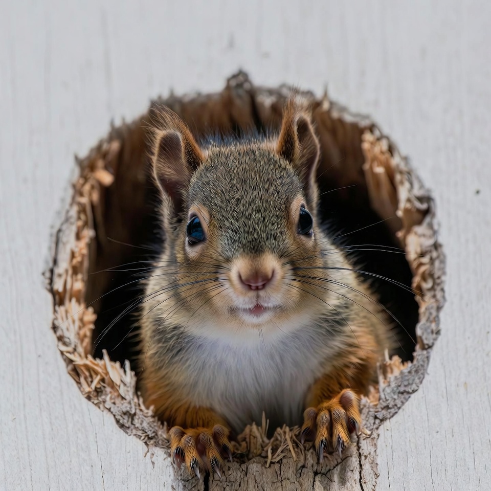 A cute squirrel with reddish-brown fur peeks out from a hole in a tree trunk. Its large dark eyes and whiskers are prominent as it looks forward with paws visible. The background is a plain white surface.