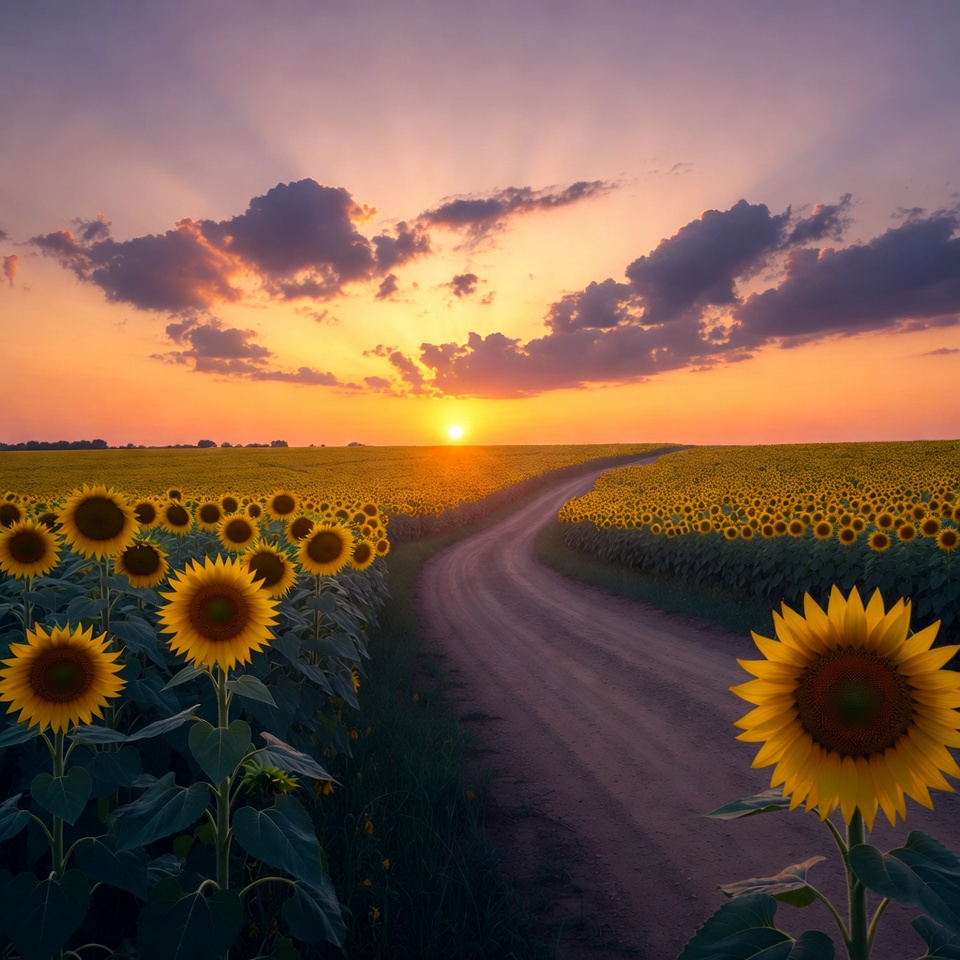 A winding dirt path cuts through a vast sunflower field at sunset. The sun glows brightly on the horizon amid scattered clouds, casting golden light on the tall sunflowers lining both sides of the path. The sky transitions from orange to purple hues.
