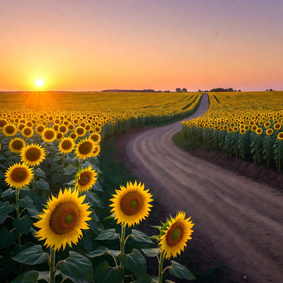 agricultural field, countryside, dirt path, dusk, field, floral field, flowers, golden hour, green leaves, horizon, nature, orange sky, outdoor scenery, path through flowers, rural, summer landscape, sunflower blooms, sunflower field, sunlight rays, sunset, trees, vibrant yellow, warm light, winding road, yellow flowers, sunflowers