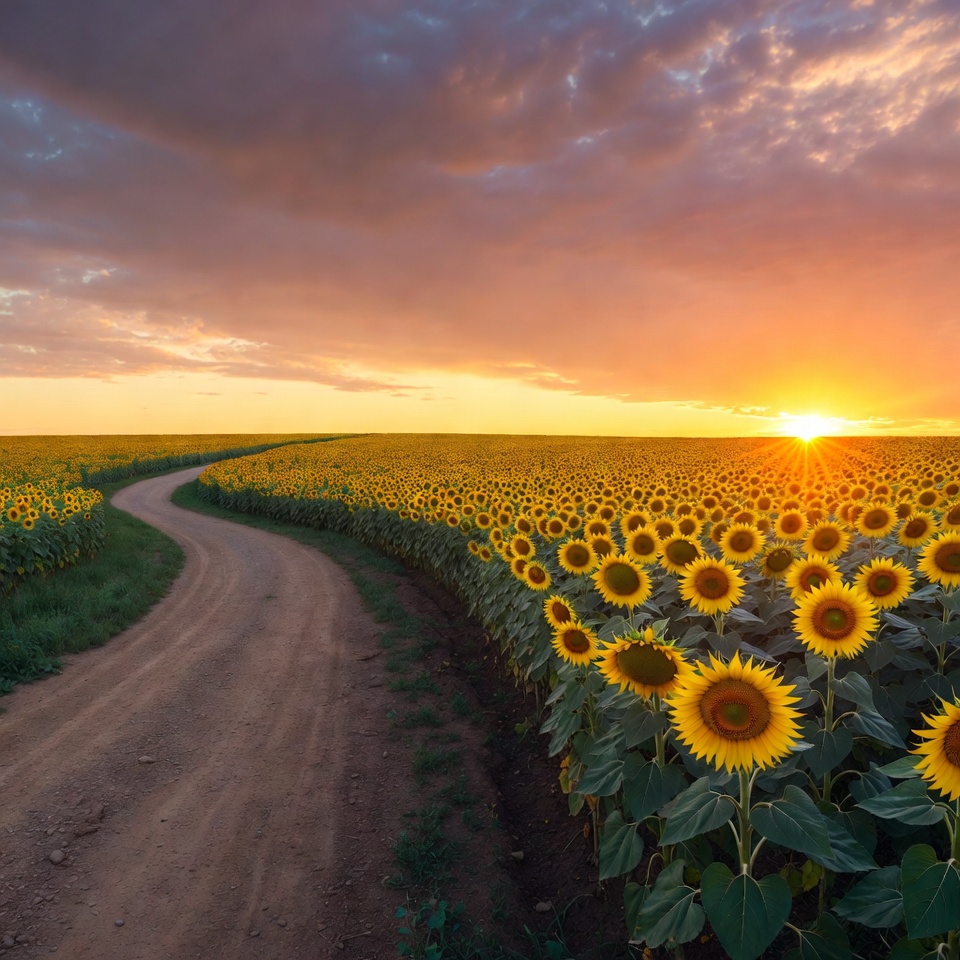 agriculture, bloom, clouds, dirt road, farmland, field, flowers, golden hour, horizon, landscape, nature, outdoor, pathway, petals, rural, scenery, sky, stems, summer, sunflowers, sunrise, sunset, trail, vibrant, winding path, yellow flowers, sunflower field