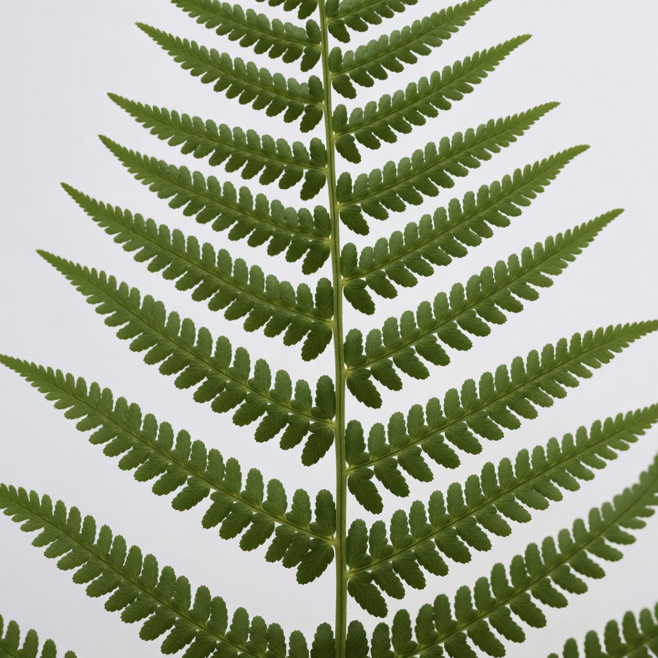 A vibrant green fern frond with delicate, feathery leaves is displayed prominently against a plain white background. The frond features numerous small leaflets arranged symmetrically along a central stem. The leaves exhibit a lush, healthy texture with fine details.