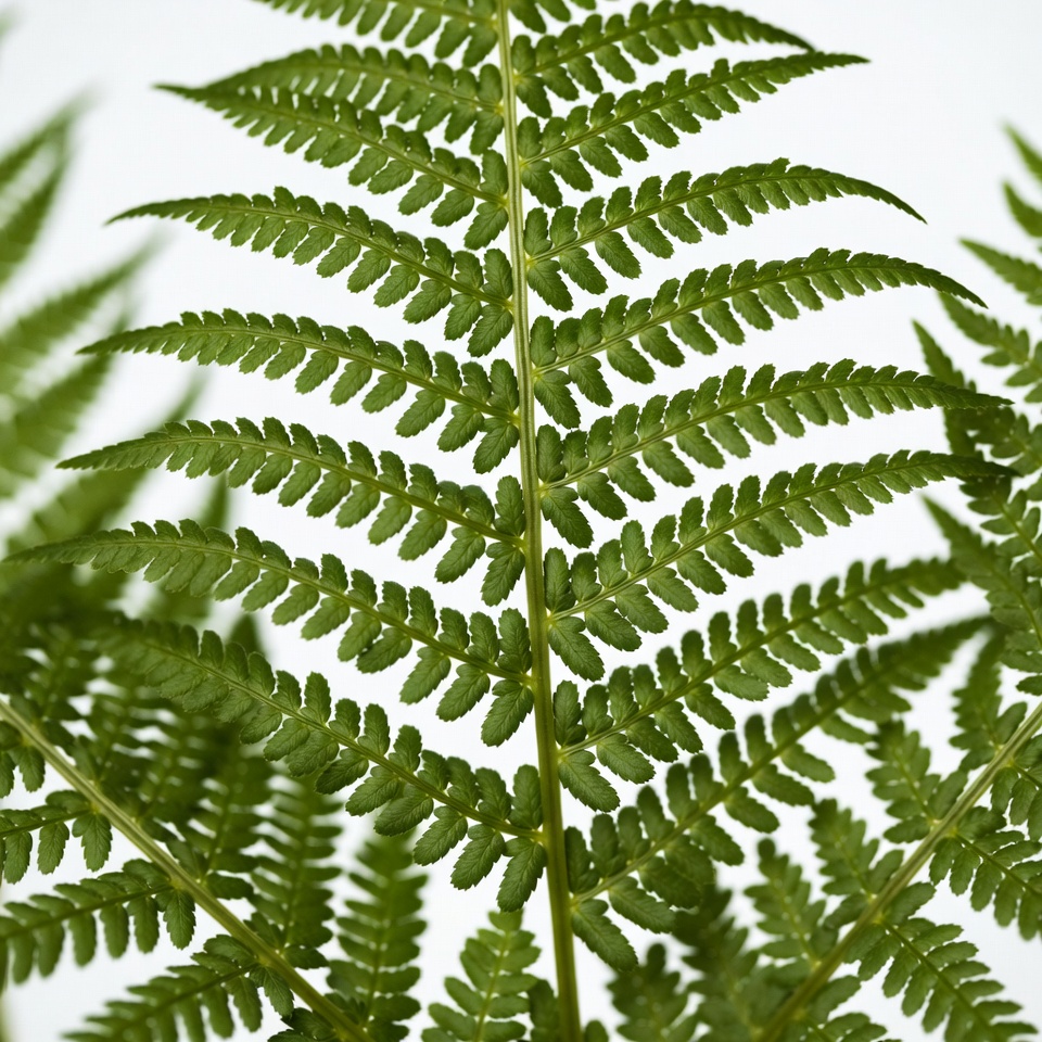 A vibrant green fern frond with delicate, feathery leaves is photographed up close against a plain white background. The intricate structure of the leaflets and stems is sharply detailed. The plant appears fresh and healthy.