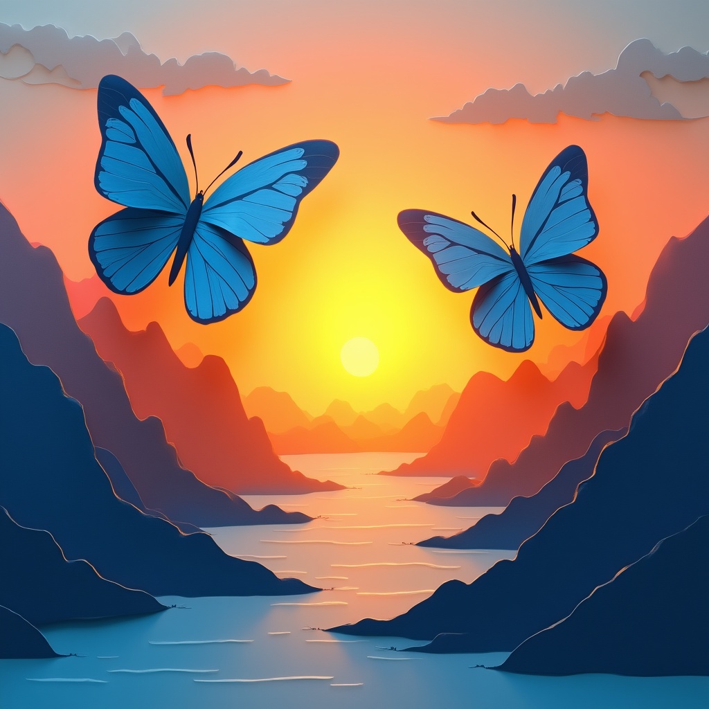 Two large blue butterflies fly above a vibrant sunset with a glowing sun centered between rugged mountains. A calm river flows through the valley below, reflecting the orange and pink sky. Fluffy clouds dot the colorful sky in this paper-cut style illustration.