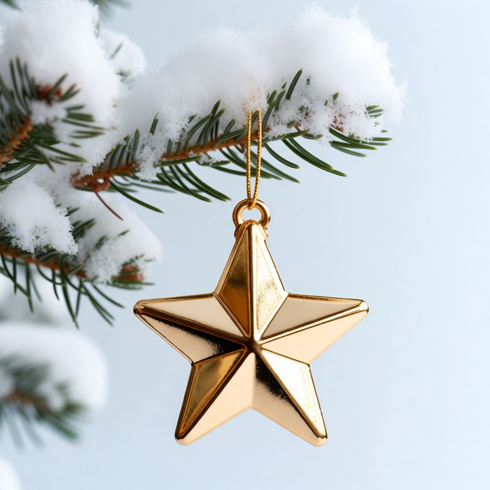 A shiny golden star Christmas ornament hangs from a fir tree branch covered in snow. The star features a pointed design with reflective gold surfaces and is suspended by a thin gold string. Snowflakes and green pine needles frame the ornament against a light blue background.
