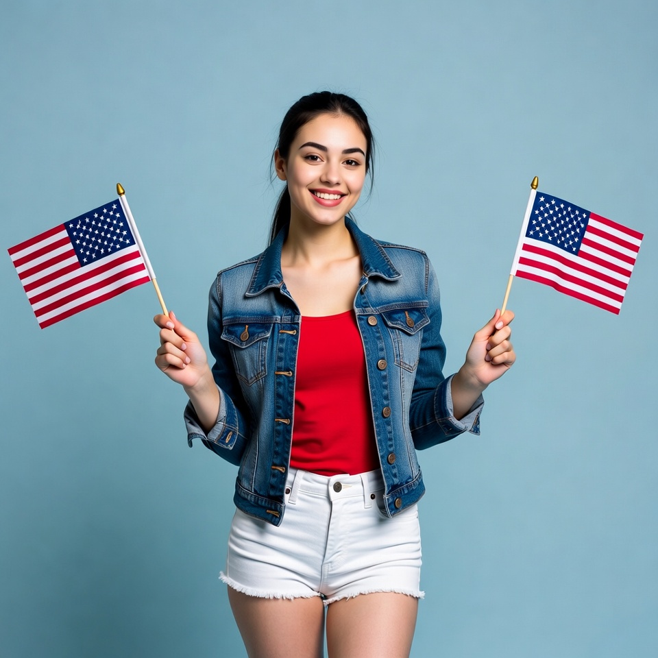 A young woman with dark hair in a ponytail smiles while holding two small American flags in her hands. She wears a red tank top, blue denim jacket, and white shorts, standing against a solid blue background. Her pose is cheerful and engaging.