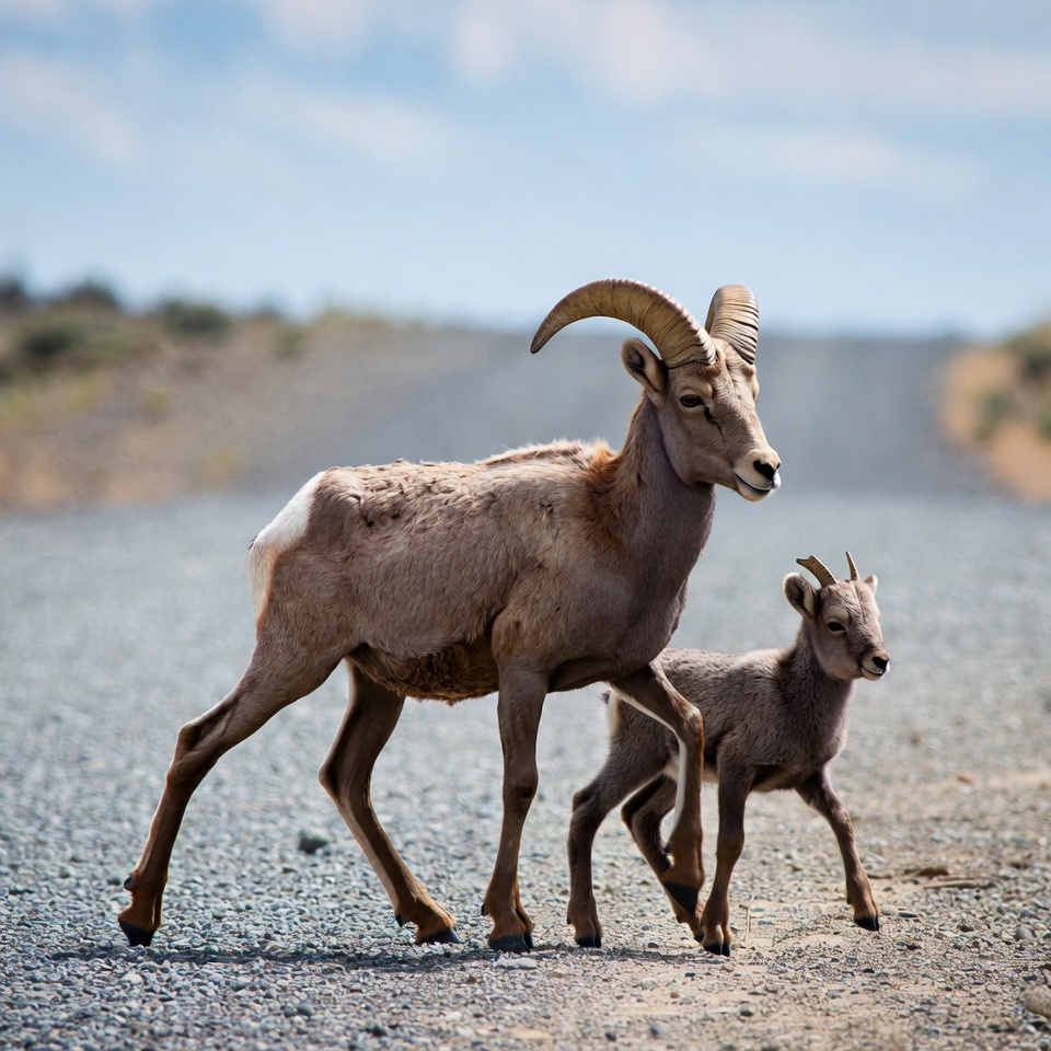 animal, baby lamb, big horns, cloudy sky, curved horns, desert landscape, gravel road, lamb, mammals, mother sheep, mountain road, nature, outdoors, rocky mountains, rocky terrain, sheep, sparse grass, walking sheep, wildlife, bighorn sheep