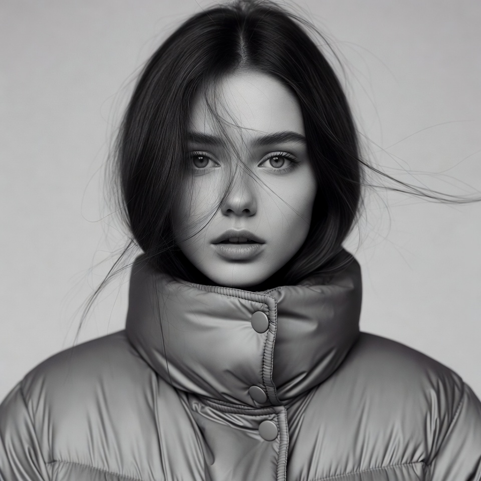 A young woman with long dark hair gazes directly at the camera in a close-up black and white portrait. She wears a shiny metallic puffer jacket with a high collar and subtle buttons. Her hair flows slightly over her face against a plain light background.
