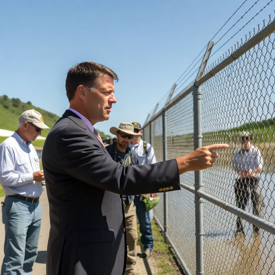 A man in a dark suit and purple tie stands beside a tall chain-link fence, pointing directly at it with his right hand. Four other men in casual work clothes, including hats and jeans, stand nearby observing. The scene is outdoors on a sunny day with green hills and a body of water visible beyond the fence.