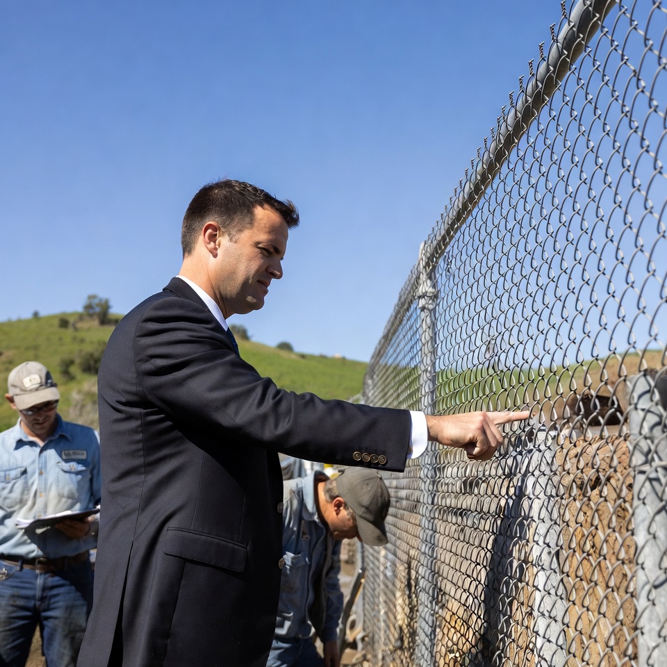 A man in a dark suit stands next to a chain-link fence on a grassy hill under a clear blue sky, pointing forward with his right hand. Two workers in beige caps, blue shirts, and jeans stand nearby, one holding tools. The fence separates them from a dirt area with rolling green hills in the background.