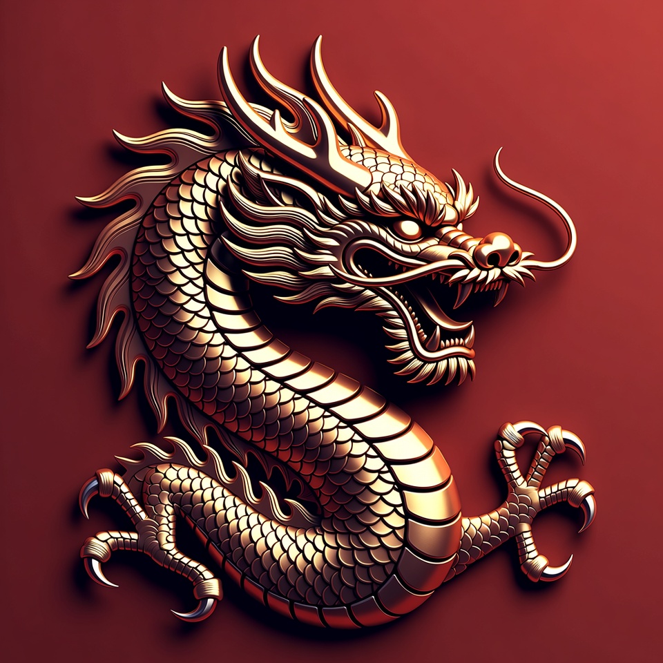 3D dragon, Asian dragon, dragon art, dragon body, dragon claws, dragon head, dragon illustration, dragon scales, dragon whiskers, embossed dragon, fantasy dragon, fierce dragon, golden dragon, isolated background, metallic dragon, mythical creature, red background, Chinese dragon
