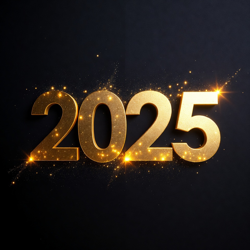 The number 2025 is crafted in bold, shiny golden letters with sparkling effects against a solid black background. Golden glitter and light bursts surround the digits, creating a festive and luxurious appearance. The design features a 3D metallic texture for added depth.
