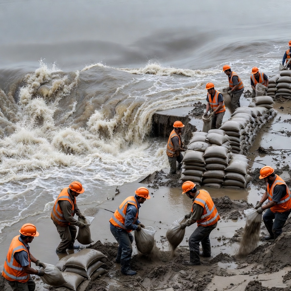 barrier building, construction workers, disaster response, embankment, emergency workers, flood, flood control, floodwaters, helmets, high visibility vests, labor, men, muddy ground, orange vests, protection wall, river flood, riverbank, safety gear, sandbags, stacking sandbags, teamwork, water barrier, water surge, waves, workers