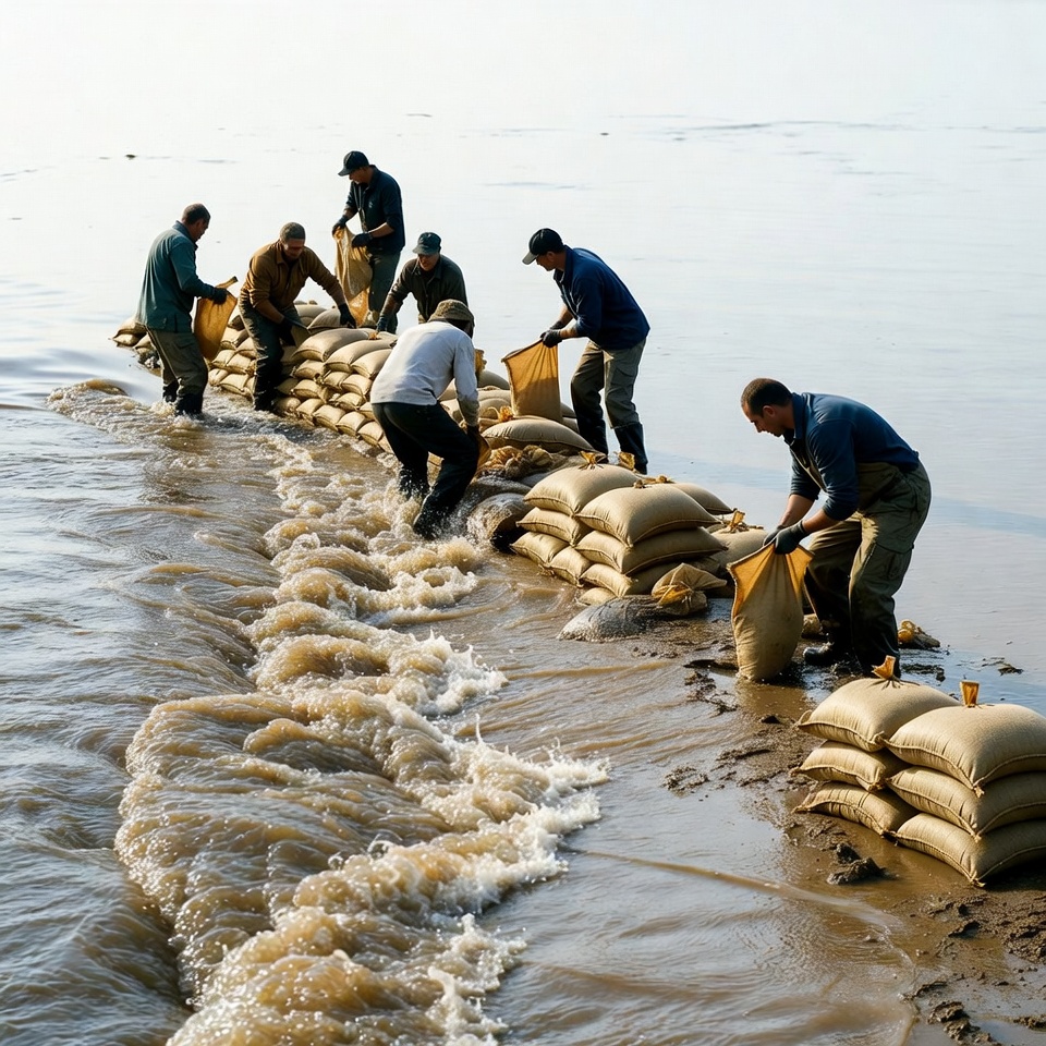 Several men in work clothes and boots stack sandbags along a riverbank to form a barrier against flooding waters. They lift and position large beige sandbags amid shallow waves and muddy terrain. The scene shows active flood prevention efforts near the water's edge.