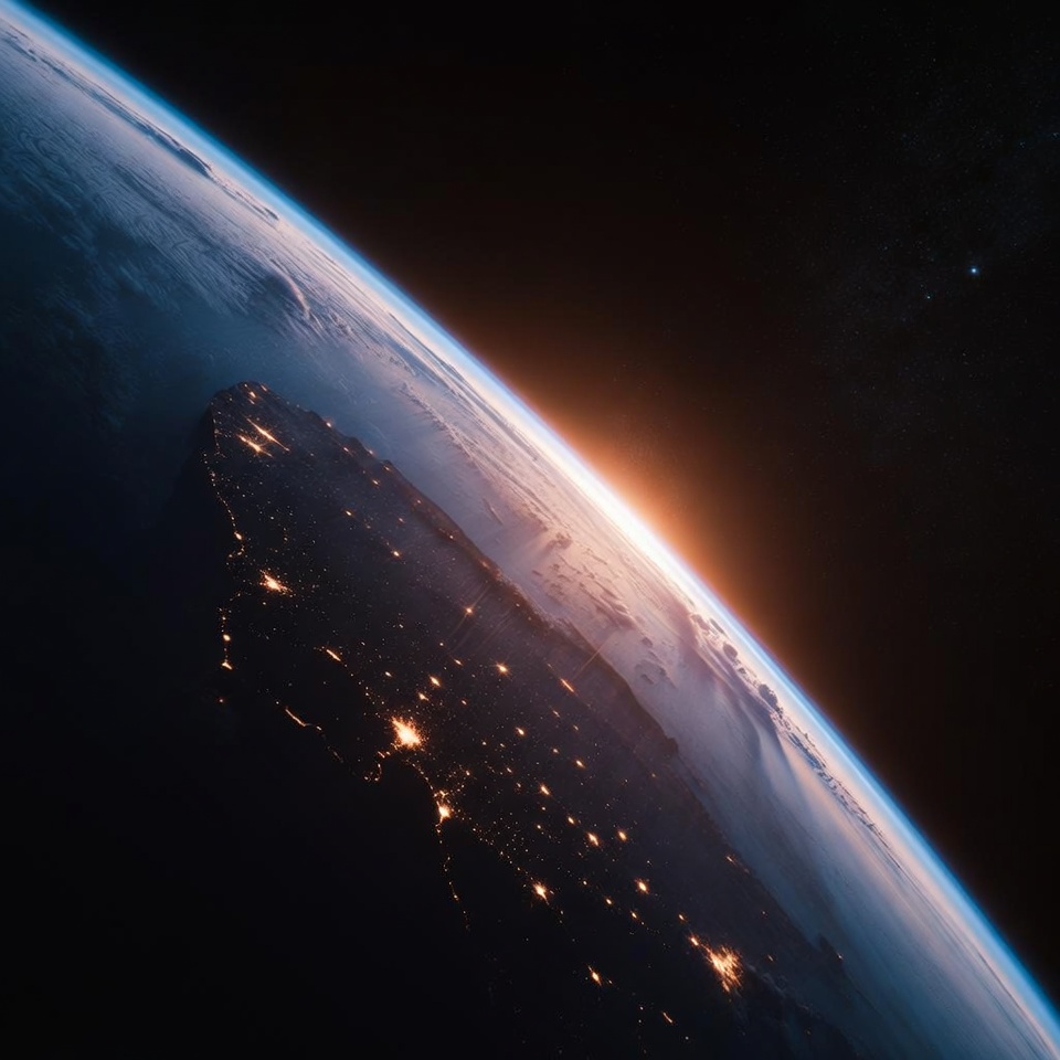 A stunning view of Earth from space shows the planet's curved horizon with city lights illuminating the west coast of North America. The dark side of the planet contrasts with the glowing atmosphere and a faint sunrise on the edge. Stars twinkle in the black expanse of space surrounding the globe.
