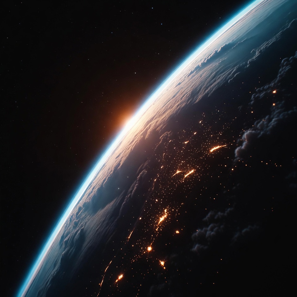 astronomy, atmosphere, aurora glow, black space, blue ocean, city lights, clouds, cosmos, curvature, dawn edge, digital art, global view, globe, glowing lights, horizon, illuminated cities, night side, orbit, planet, satellite view, sci-fi, space, stars, sunrise, universe, world map, Earth