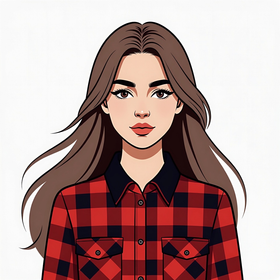 White, beautiful woman, black collar, brown hair, cartoon, clipart, drawing, eyeliner, female, illustration, isolated background, long hair, pink lips, plaid shirt, portrait, red plaid, wavy hair, young woman, woman