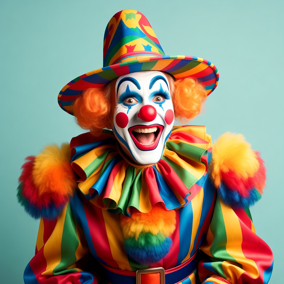 A clown with exaggerated white face makeup, bright blue eyes, and a large red nose grins widely. He wears a multicolored striped jester outfit with fluffy orange pompoms on the shoulders and a large rainbow hat. The clown stands against a solid light blue background.