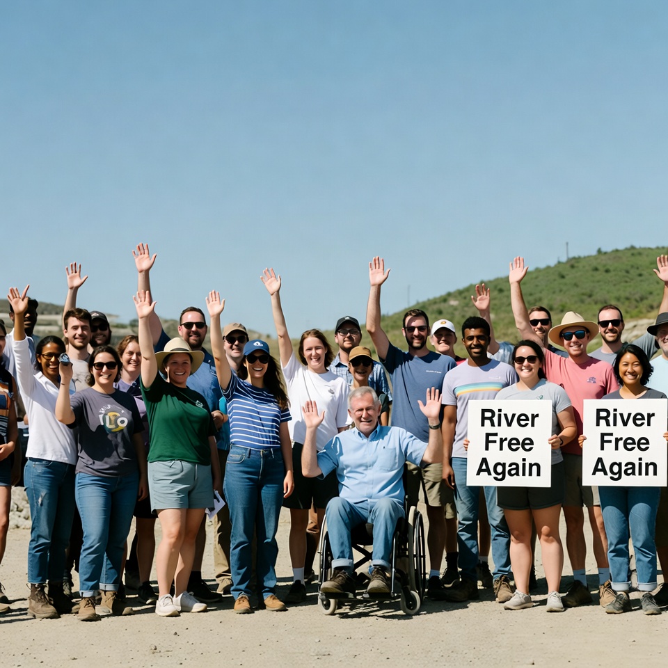 A large diverse group of men and women stands together outdoors on a dirt ground with hills in the background, raising their hands enthusiastically. Many hold signs reading 'River Free Again' and wear casual outdoor clothing like jeans, t-shirts, and hats. An older White man in a wheelchair is positioned in the center among the smiling crowd.