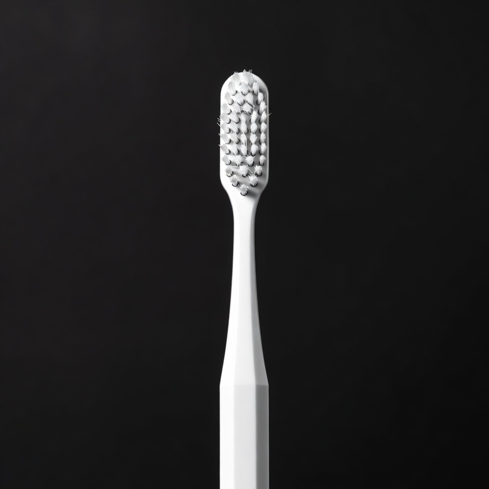 A white toothbrush with gray bristles stands upright against a solid black background. The handle is hexagonal and smooth, while the bristles are densely packed. It is isolated for a clean product view.