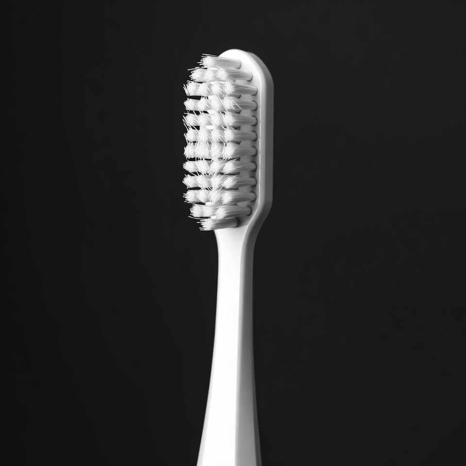 A white plastic toothbrush with soft bristles stands upright against a solid black background. The handle is long and slender, and the bristles are densely packed and slightly flared. It is centered and sharply focused for a clean product view.